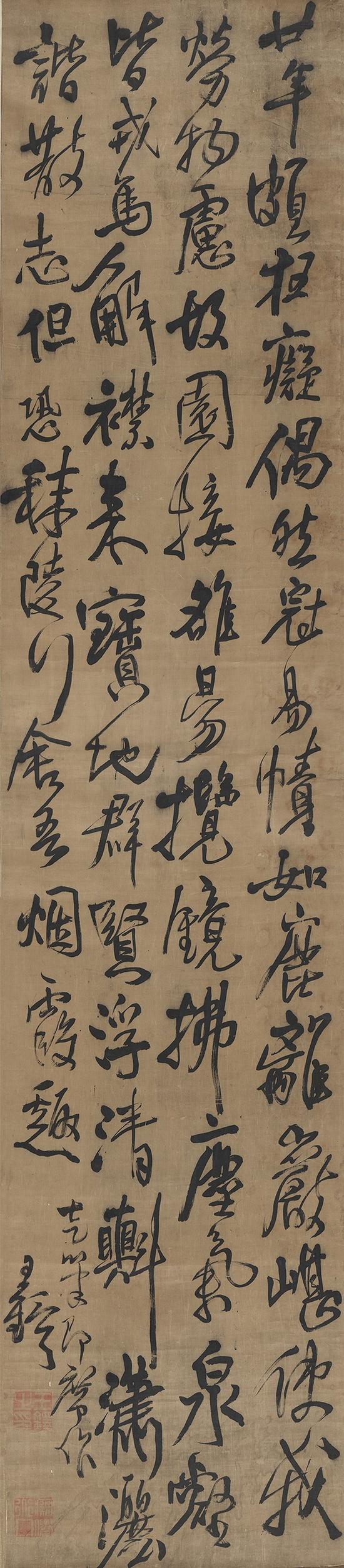 书法方面,此轴用笔较为洒脱灵通,行笔较为迅捷,但又收得住笔。点画粗细顿挫,结体倚侧者多,右倾、左倾相互错落,跌宕起伏。明项穆《书法雅言》曰:“书法要旨,有正与奇。所谓正者,偃仰顿挫,揭按照应,筋骨威仪,确有节制是也。所谓奇者,参差起复,腾凌射空,风情姿态,巧妙多端是也。奇即连于正之内,正即列于奇之中。正而无奇,虽庄严沉实,恒朴厚而少文。奇而弗正,虽雄爽飞妍,多谲厉而乏雅。”以此言之,此轴可称奇正相生的佳作,整体看来,章法协调,气势磅礴。