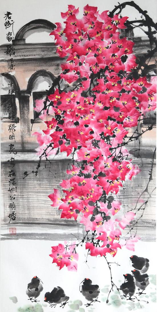 张明亮《老街春歌》纸本水墨 138x69cm 2015
