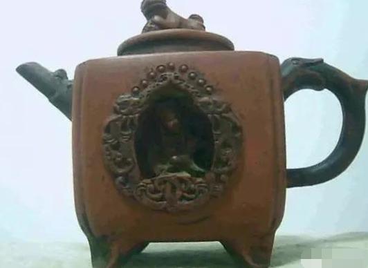 这是一把清末民初年间的紫砂壶。壶体颜色似瓷器中的茶叶末釉,壶身正面是一个凹进去的龛,内坐一人,龛外壁装饰有桃树、桃花、桃叶。壶身另外三侧为雕刻的云纹。